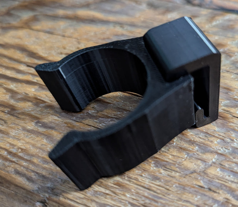 Arsenal X20 molle caddy (1.25" round stick). The caddy stays on your saddle or pack's 1" molle loops and stick can be clipped in and removed easily. Caddy fits stick with or without stealth strip. Two pieces held together with a stainless steel screw. Sticks/saddle/pack not included.
