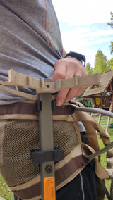 Climbing stick caddy designed for 1" square tube climbing sticks (XOP, Latitude, etc). The bracket stays on the stick and the back clip easily lifts on/off a molle loop or a 1" belt for when climbing. Two pieces held together with a stainless steel screw. Pictured with bracket are XOP climbing sticks (saddle and stick(s) not included).